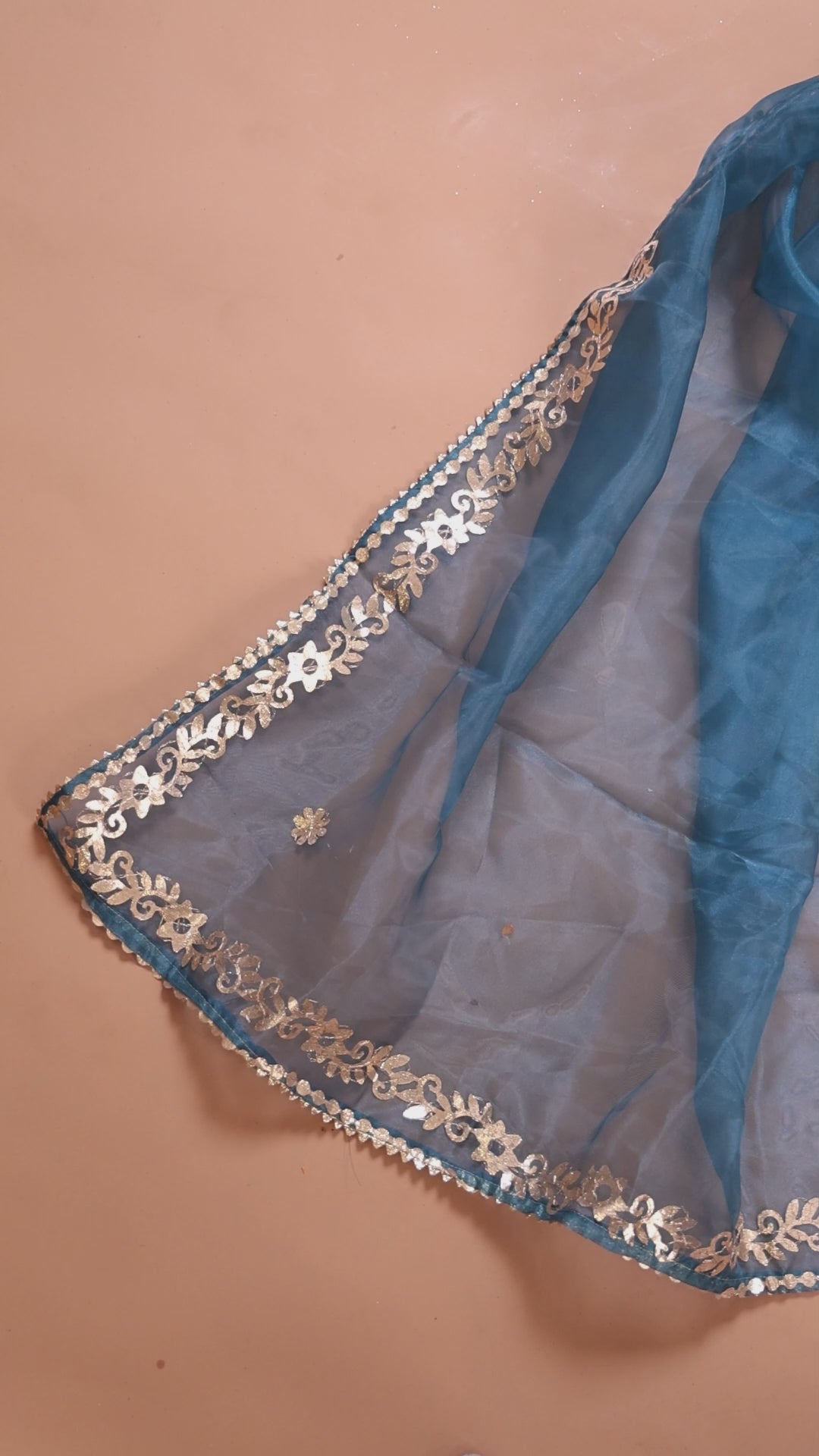 Deep Teal Blue Unstitched Organza Tissue Suit Set with Gota Patti & Pearl Handwork