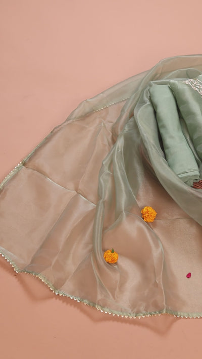 Drape yourself in elegance with this Soft Sage Green Unstitch Suit Set, a stunning blend of intricate craftsmanship and luxurious design. The kurta, made from premium Organza Tissue, is adorned with handcrafted heavy Gota Patti and pearl work, exuding traditional charm and sophistication. Paired with a matching Soft Sage Green Organza Tissue dupatta featuring exquisite Heavy Rajasthani Gota work and a soft Santoon bottom, this ensemble is perfect for weddings, festive occasions, and grand celebrations.