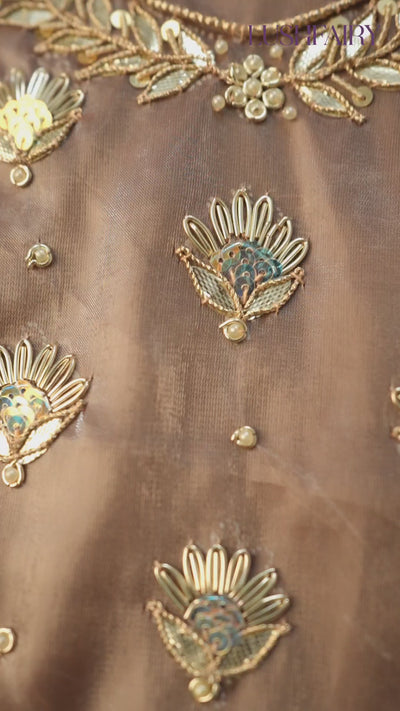 Autumn Copper Elegance Unstitched Jimmy Choo Silk Suit Set with Handcrafted Gota Patti & Pearl Detailing