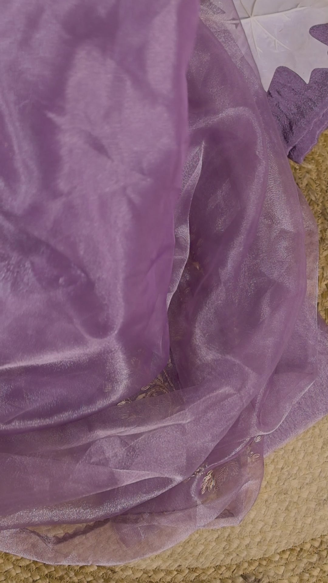 - Organza Tissue fabrics lend a light, flowing quality to the ensemble.