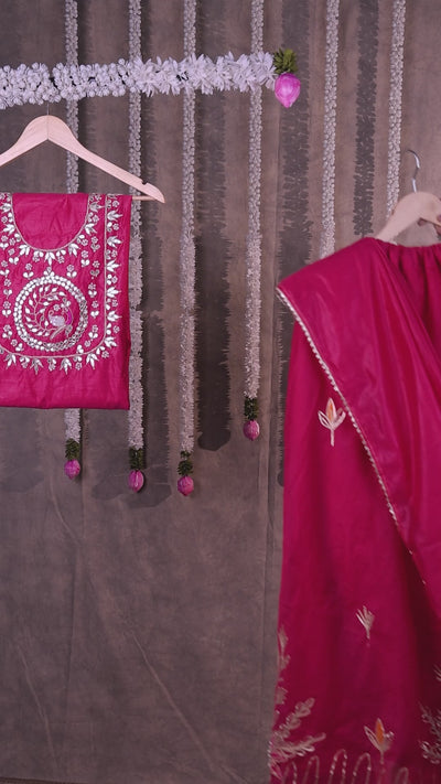 Drape yourself in regal elegance with this Maharani Magenta Pink Semi-Stitched Lehenga Set, designed to reflect luxury, tradition, and fine craftsmanship. Made from Premium Chanderi Silk, this exquisite ensemble is adorned with handcrafted Gota Patti, pearl, and Rani thread work, creating a rich and intricate design. The stitched lehenga with opulent Gota artistry and a 1.5-meter flair ensures a grand and voluminous silhouette, perfect for weddings, festive celebrations, and cultural occasions.