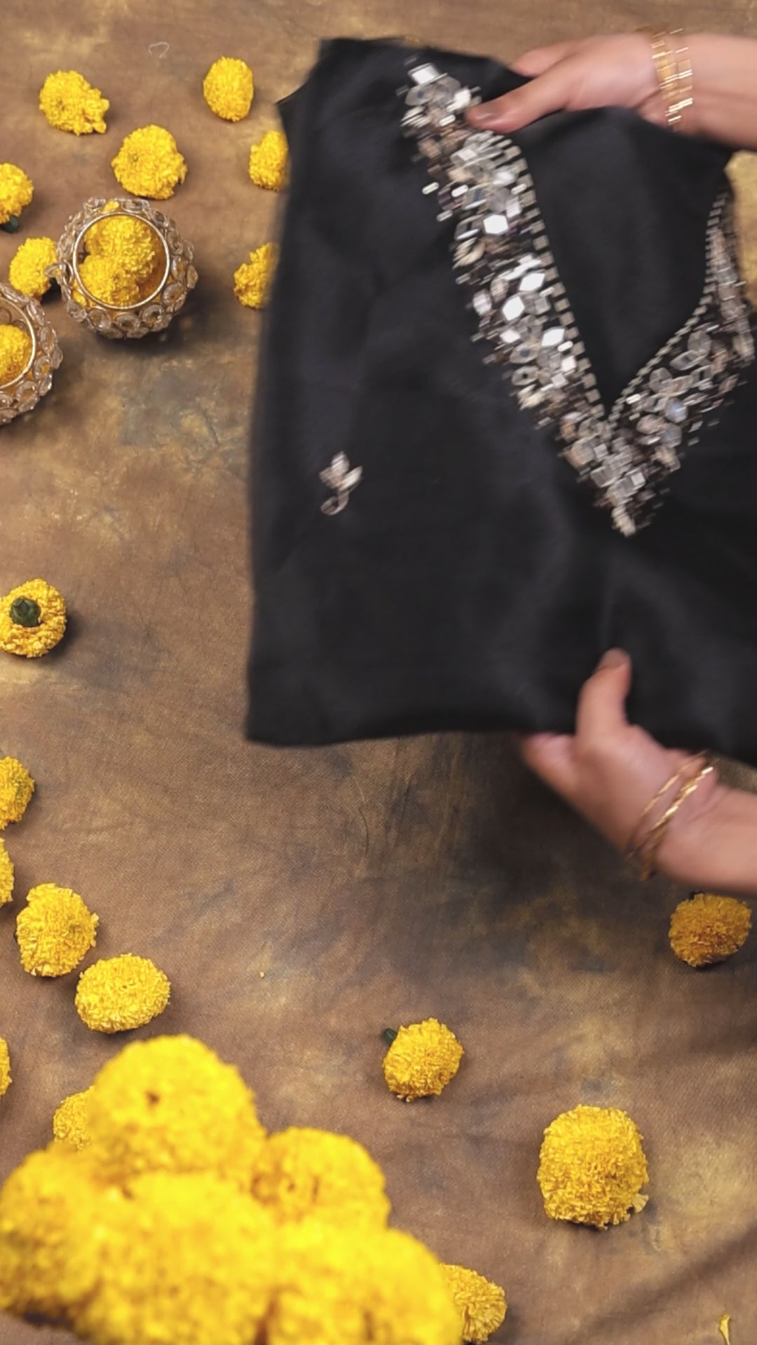 Make a bold and timeless statement with this Midnight Black Unstitch Suit Set, crafted for those who appreciate elegance with a touch of artisanal glamour. The kurta, made from premium Organza Tissue fabric, features a V-neckline adorned with intricate artisanal mirror work, creating a dazzling and sophisticated appeal. The ensemble is complemented by a Midnight Black Organza Tissue dupatta, exquisitely finished with Gota Patti lace, and a matching Santoon bottom for a seamless and regal look. Perfect for festive occasions, weddings, and evening celebrations, this suit set blends tradition with modern luxury.