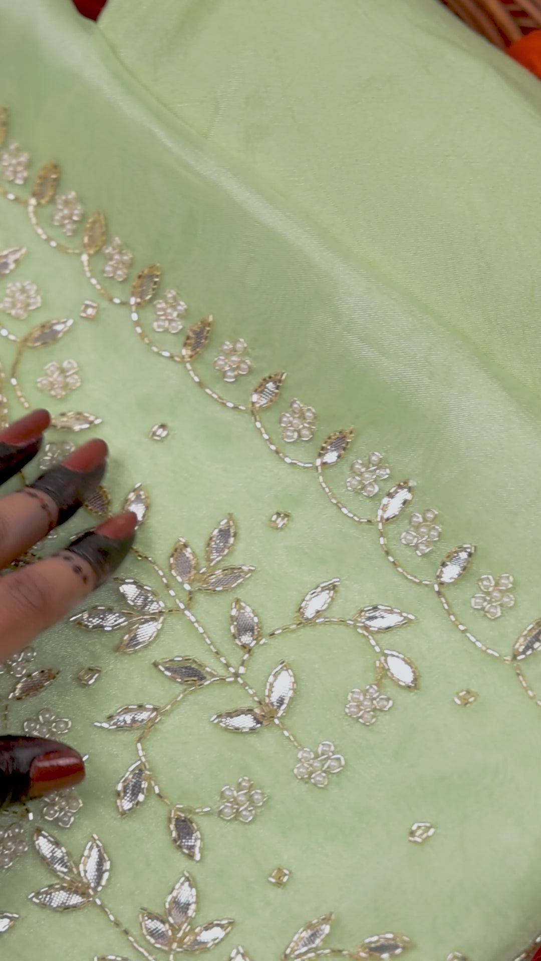 Step into refined elegance with this Mint Radiance Unstitch Suit Set, a stunning combination of traditional craftsmanship and contemporary sophistication. The kurta, crafted from luxurious Organza Tissue, is adorned with handcrafted heavy Gota Patti and pearl work, offering a rich and timeless appeal. Paired with a matching Mint Radiance Organza Tissue dupatta featuring exquisite Heavy Rajasthani Gota work, and a comfortable Santoon bottom, this ensemble is perfect for weddings, festive occasions, and grand celebrations.