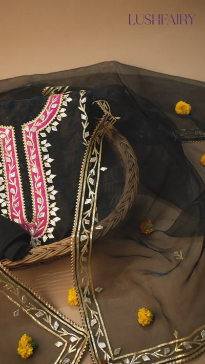 Make a bold yet elegant statement with the Noir Bloom Unstitched Suit Set, a harmonious blend of timeless black and festive flair. The kurta, crafted in sheer organza tissue, is adorned with exquisite handcrafted Gota Patti embroidery, brought to life by striking hot pink hues that add a vibrant pop of color. Paired with a heritage-inspired dupatta featuring premium Gota Patti detailing, and a matching black Santoon bottom, this ensemble is designed to capture attention while reflecting tradition.