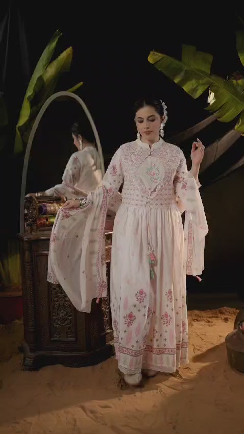 This stunning set features a soft and breathable cotton mulmul kurta and bottom, layered with an exquisite jacket adorned with hand embroidery, mirror work, and intricate thread detailing. The look is completed with a lightweight, printed dupatta that adds a playful touch to the soft, pinkish cream base.
