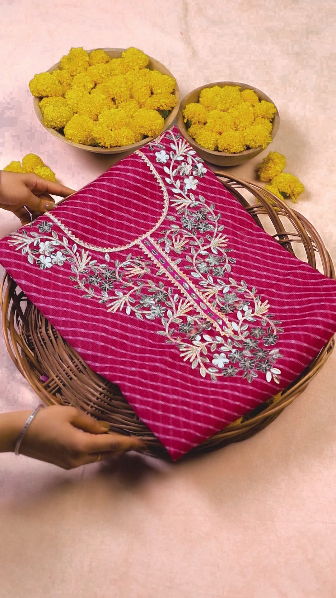Step into timeless elegance with the Rani Radiance Unstitched Suit Set, a captivating ethnic ensemble that beautifully blends traditional craftsmanship with graceful fabric. The Rani color Kota Doria kurta features exquisite sheen golden Gota Patti work, offering a radiant and refined look. Paired with a Rani Lahariya dupatta in matching Kota Doria, adorned with ornate gota detailing, and a Santoon bottom, this suit set brings unmatched charm for festive and cultural occasions.