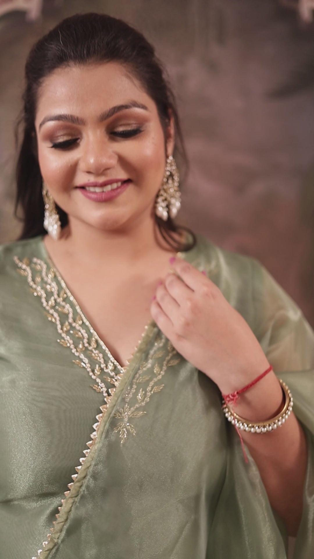 Drape yourself in elegance with this Soft Sage Green Unstitch Suit Set, a stunning blend of intricate craftsmanship and luxurious design. The kurta, made from premium Organza Tissue, is adorned with handcrafted heavy Gota Patti and pearl work, exuding traditional charm and sophistication. Paired with a matching Soft Sage Green Organza Tissue dupatta featuring exquisite Heavy Rajasthani Gota work and a soft Santoon bottom, this ensemble is perfect for weddings, festive occasions, and grand celebrations.