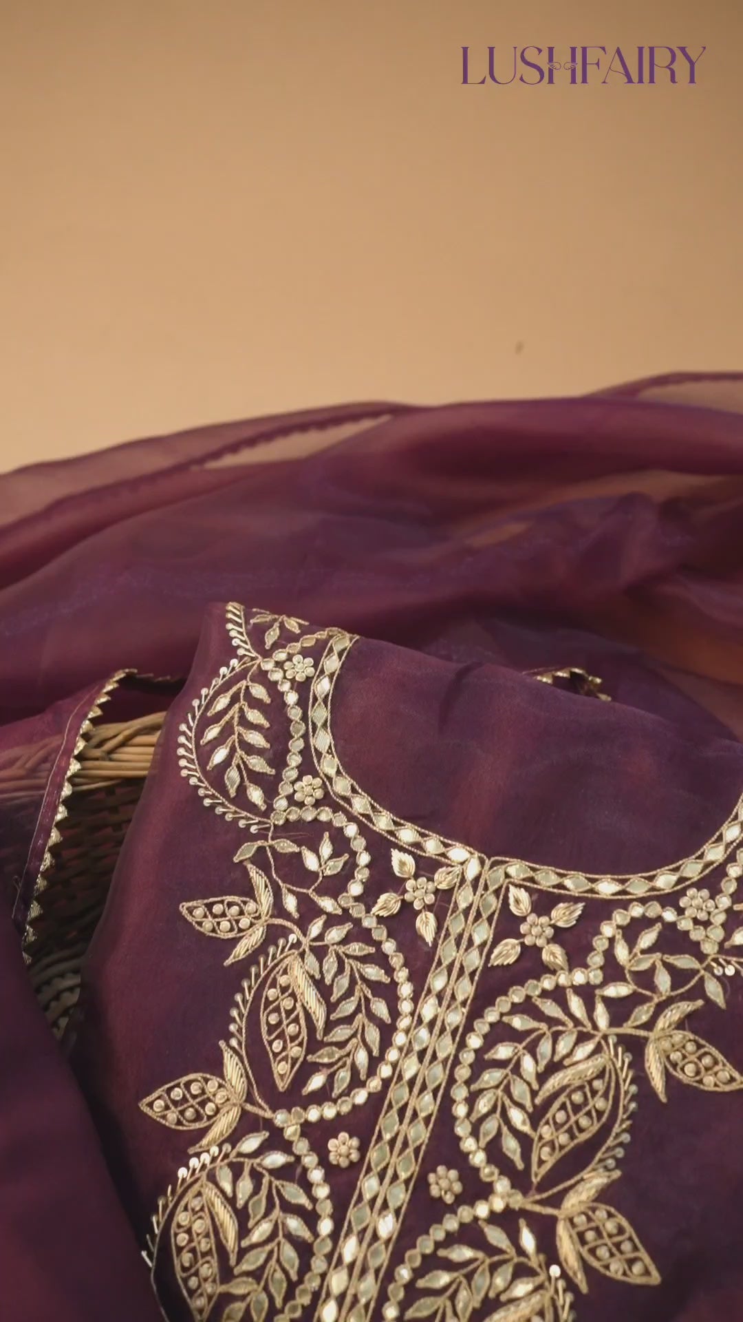 Subtle Merlot Grace Unstitched Organza Tissue Suit Set with Heritage Gota Patti, Pearl & Zardozi Handwork